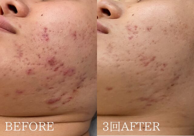 2回目、3回目とご来店のたびにお肌の様子は大きく変化し、真っ赤だったニキビ跡は一気に落ち着き、炎症ニキビはほぼ見られない状態に近づいていきました。